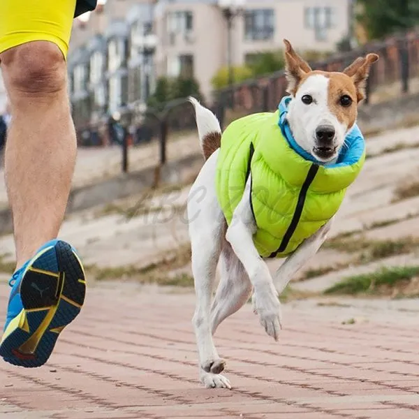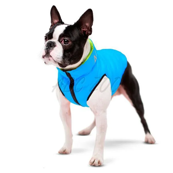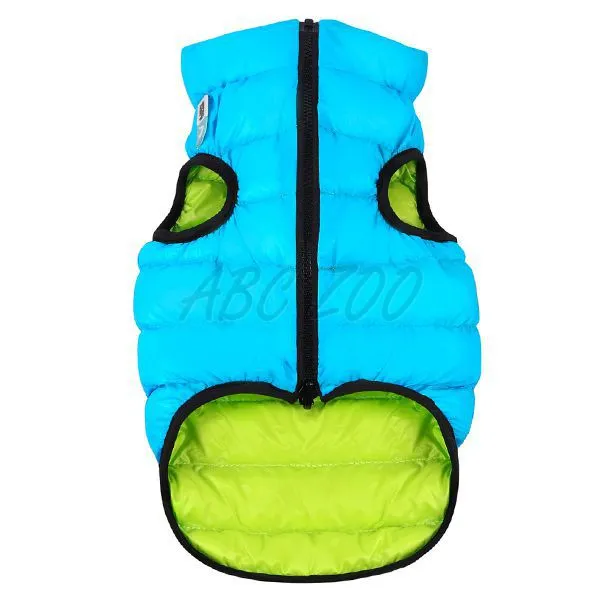 Vestă ușoară, călduroasă, dublă, în culorile albastru-verde, potrivită pentru câinii de talie mică.