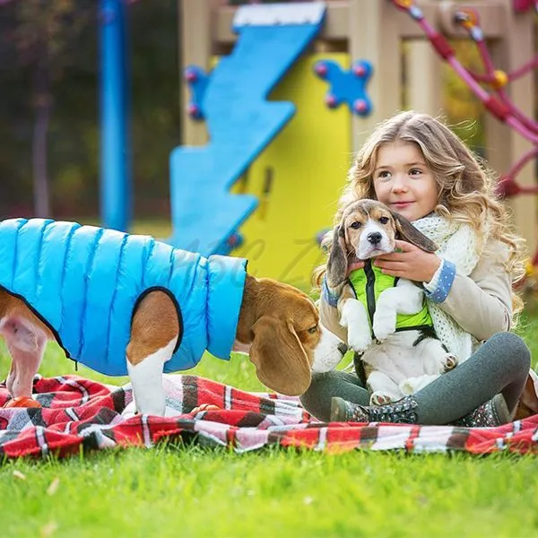 Vestă ușoară, călduroasă, dublă, în culorile albastru-verde, potrivită pentru câinii de rasă mică.