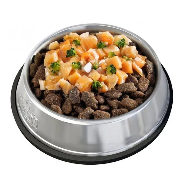 Hrană suplimentare care conține bucăți de somon și legume în sos delicios, potrivită pentru câini.   Mai multe detalii