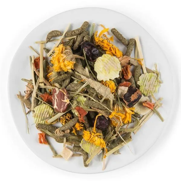 Ingrediente: produse secundare vegetale (4 % timoftică, 3 % gălbenele , 0,2 % urzică), legume (1 % piper), semințe, fructe (4 % măceșe), uleiuri și grăsimi, minerale