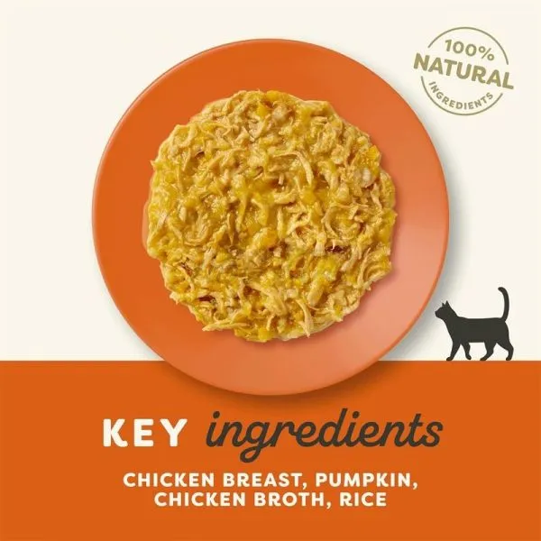 Compoziție: Piept de pui 50%, dovleac 25%, supă de pui, orez