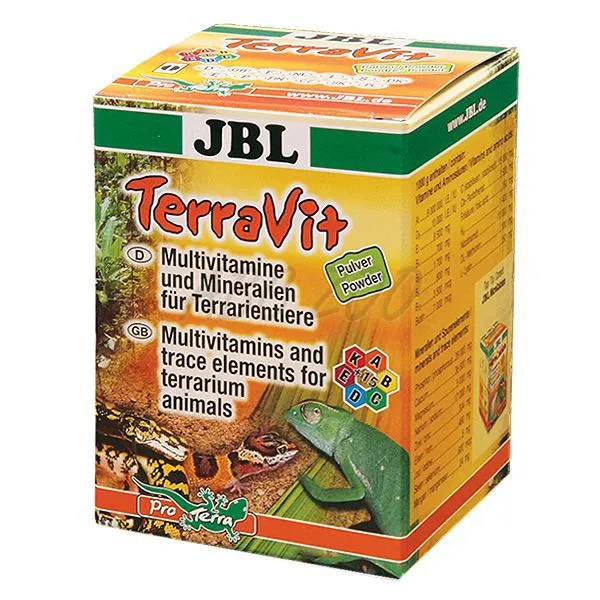 JBL TerraVit Pulver conține un complex special de vitamine, minerale și oligoelemente, concepute pentru a îndeplini cerințele animalelor de terariu (reptile și amfibieni).