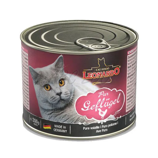 Pisica este un animal carnivor. Conservele LEONARDO® Premium sunt obținute din carne de cea mai bună de calitate. În cadrul procesului de fabricare sunt prelucrate doar materiile prime de cea mai bună calitate. Produsele LEONARDO® Super Premium nu sunt ieftine, deoarece carnea de bună de calitate excepțională este mai scumpă. Valoarea biologică a conservelor este înaltă, fapt pentru care este suficientă o cantitate mai mică pentru o nutriție bună. Datorită acestuia scade și cantitatea materiei fecale. Hranele LEONARDO® Super Premium nu conțin coloranți sintetici, substanțe de arome și nici conservanți. Materia primă a conservelor provine din ferme din germania și carnea proaspătă este prelucrată de îndată.