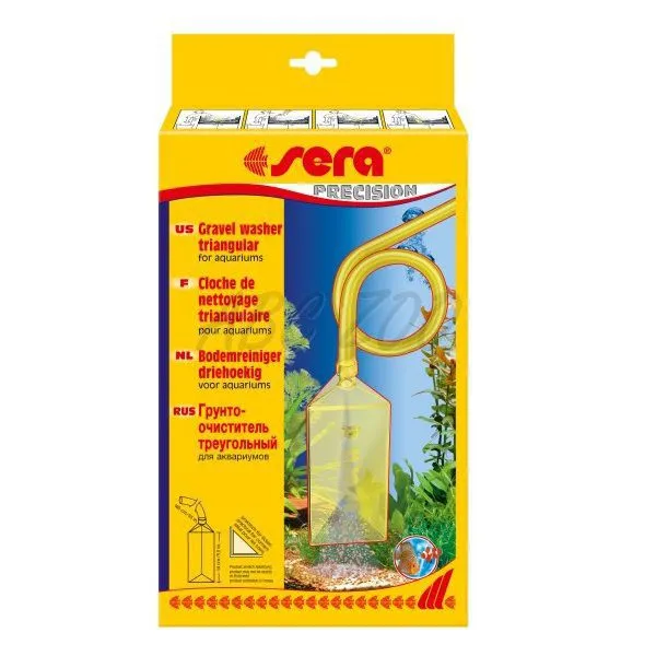 Acesta este potrivit pentru acvarii mici unde se poate ajunge confortabil până în colțuri. Simultan cu eliminarea nămolului efectuează o schimbare parțială a apei. Nu este bine să se schimbe apa (și o mulțime), la intervale lungi, deoarece perturbă echilibrul biologic și dăunează peștii și plantele (a se vedea ghiduri Sera sau pe internet). Utilizarea curățătorului de pietriș este clară din imaginile de pe ambalaj. Pe peretele lateral este o gaură blocată de un opritor. În timpul îndepărtării nămolului elimină dopul și acoperă gaura cu degetul. Dacă în timpul curățării luați în mod accidental un pește sau alte particule pe care nu doriți să fie spalate, doar strangulați furtunul sau ridicați ușor curățătorul deasupra suprafeței apei.