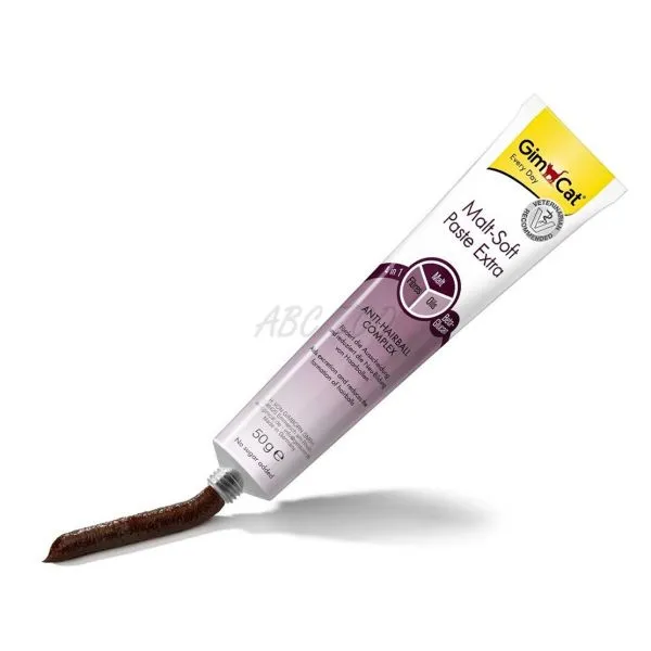 Complexul tip pastă anti-ghemotoace GimCat Malt Soft Extra Paste are un triplu efect – facilitează eliminarea părului înghițit, reduce formarea de ghemotoace de păr și previne problemele digestive.