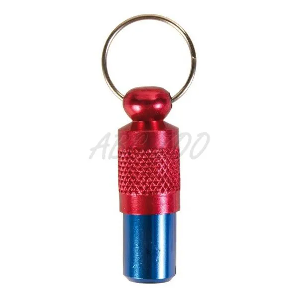 Medalion de identificare pentru căței, de mici dimensiuni, realizat din fier, de culoare roșie cu albastru.