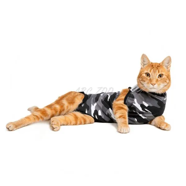 • centura moale, elastică și protectoare din jurul părții din față, a picioarelor din spate și a cozii asigură faptul că acest Costum de Recuperare ® nu taie pielea, astfel încât pisicile se pot mișca libere