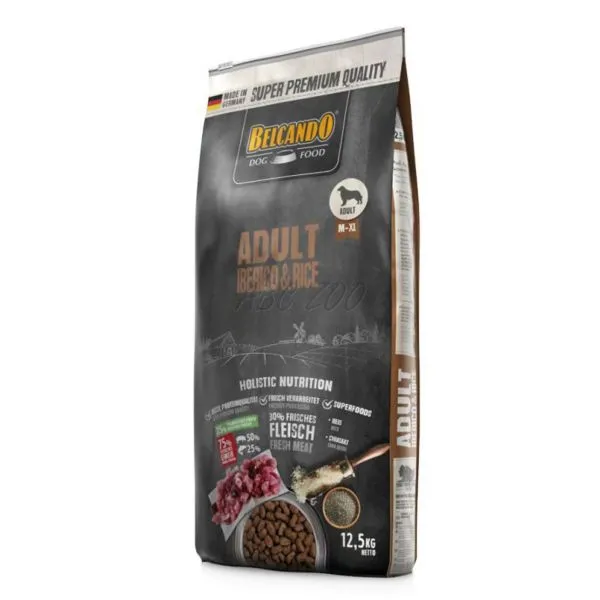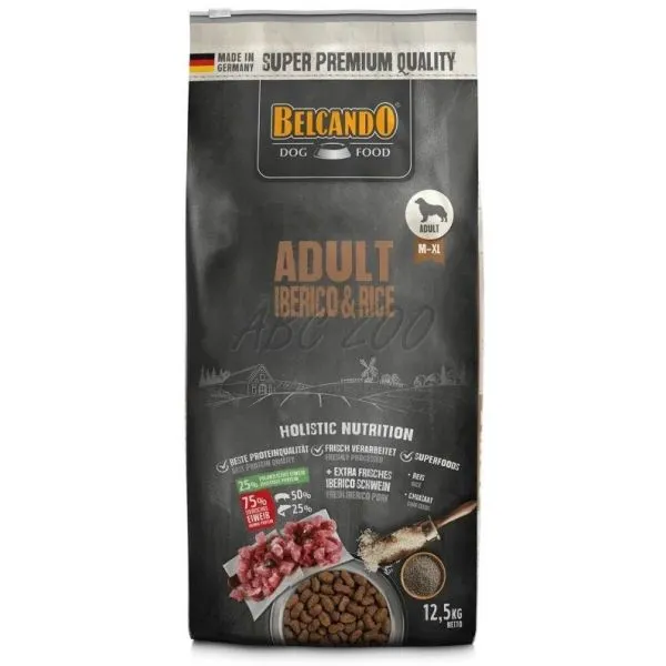 Hrană completă super premium cu porc iberic și orez pentru câinii adulți mofturoși de talie medie și mare.