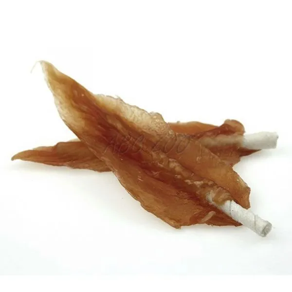Recompensă de mestecat pentru caini cu felii de piept de pui si betişoare din piele de bivol.
