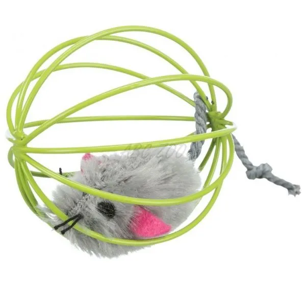Jucărie pentru pisici - minge confecționată din sârme de metal cu un șoricel în mijloc.