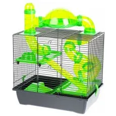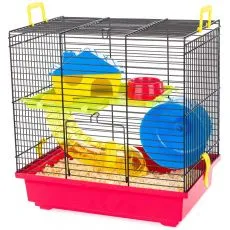 Cuşcă potrivită pentru hamsteri, care este dotat cu etaj, tunel, castron. caşută si roată pentru...