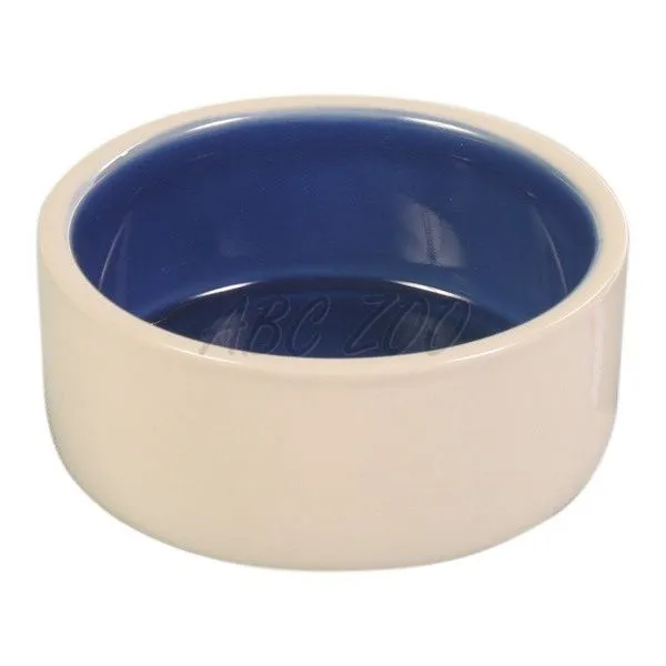 Un bol ceramic greu , pentru hrană sau apă de câine , în culorile crem și albastru