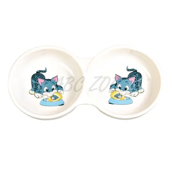 Castron dublu din ceramică pentru pisici, adecvat pentru hrană uscată şi apă de băut, cu model de pisică.