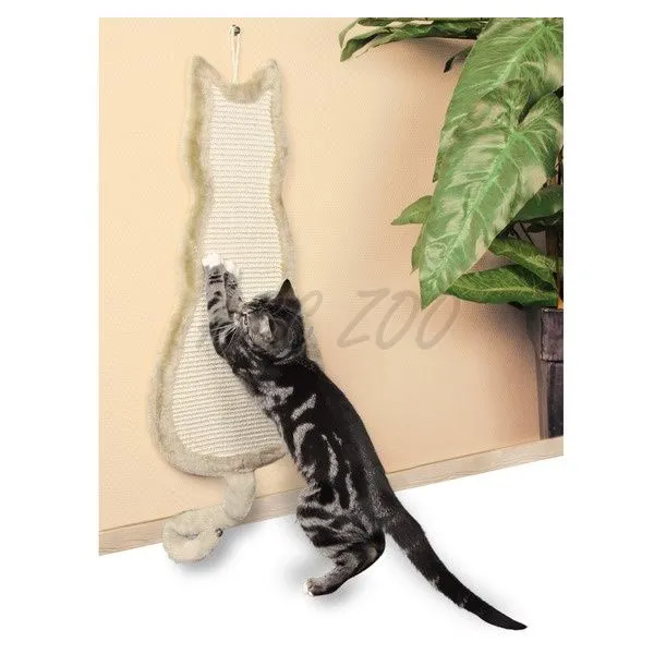 Cânepă sisal de culoare bej și cu forma unei pisici, montabil pe perete, dotat cu clopoțel și cu margini de acoperire de material pluș.