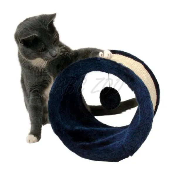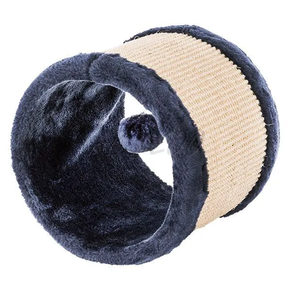Ansamblu pentru pisici realizat din cânepă sisal, cu formă de tunel din pluș și cu perne de pluș în interior, dotat cu o minge cu clopoțel.