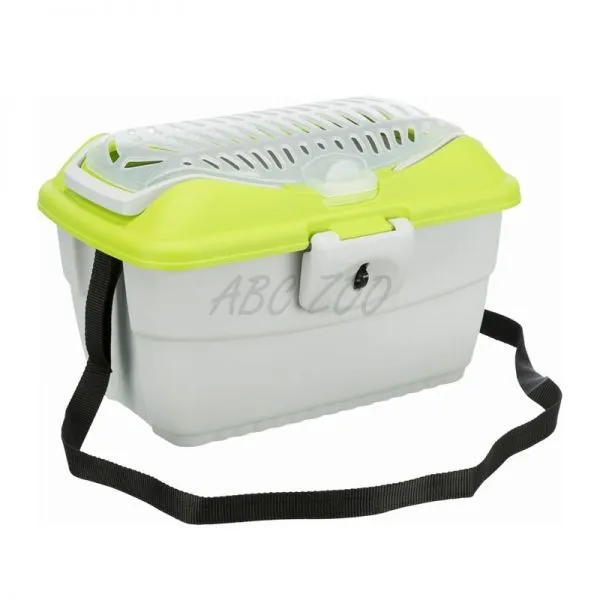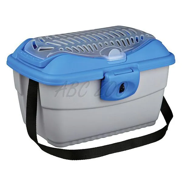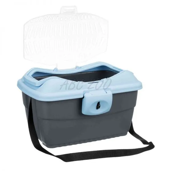 Cutie transport din material plastic, pentru cobai, iepuri şi alte rozătoare - disponibil în culoarea albastru - argintiu - este dotat cu bretele.