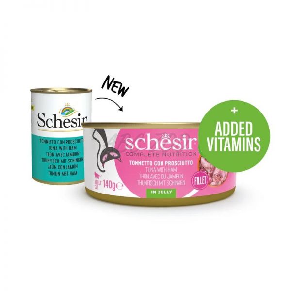 Schesir conservă, pentru pisicile adulte, cu ton și șuncă în gelatină.