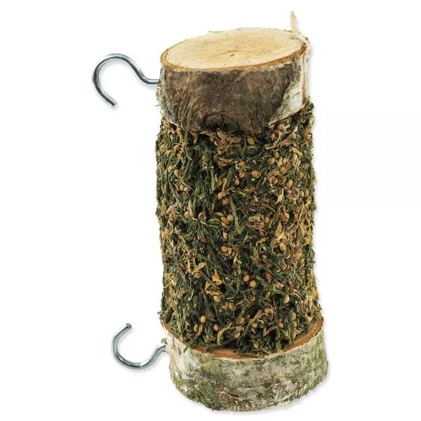 Cilindru de lemn care conține pătrunjel, petale de trandafir și gălbenele pentru iepuri și rozătoare.