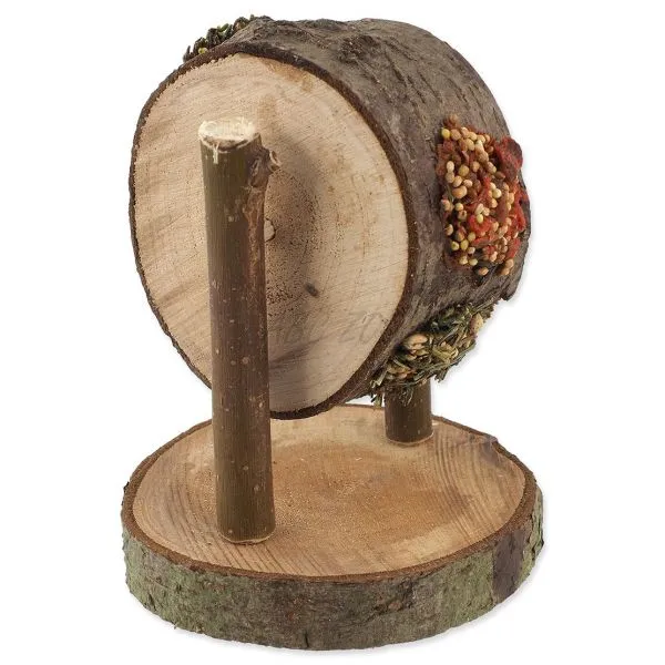 Jucărie tip rotiță de lemn umplută cu morcovi, pătrunjel și mei pentru iepuri și rozătoare.