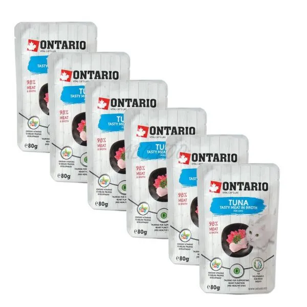 Pliculeț Ontario pentru pisicuțe peste 4 luni și pisici adulte cu bucăți proaspete de ton și pui în fiertură, cu un conținut de până la 98 % carne.