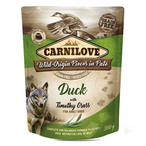 Carnilove este o hrană umedă, în pliculeț, pentru câinii adulți, cu carne de rață și timoftică, fără cereale sau cartofi.