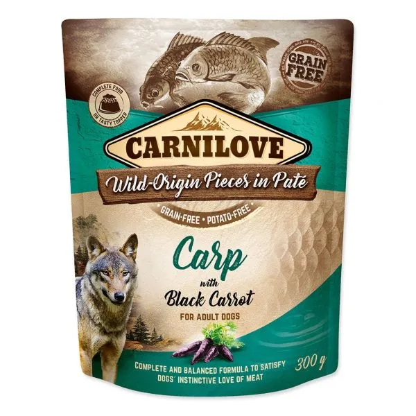 Carnilove este o hrană umedă, în pliculeț, pentru puii de câine, cu crap și morcovi negri, fără cereale sau cartofi.
