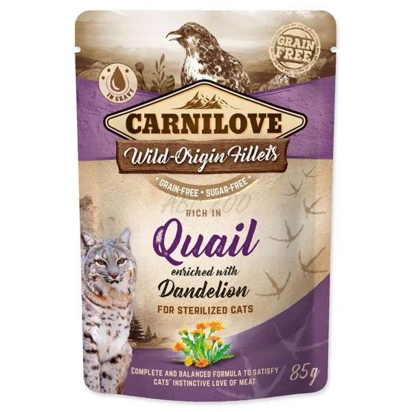 Carnilove este o hrană umedă, în pliculeț, pentru pisicile adulte sterilizate, cu carne de prepeliță și păpădie, fără cereale sau cartofi.