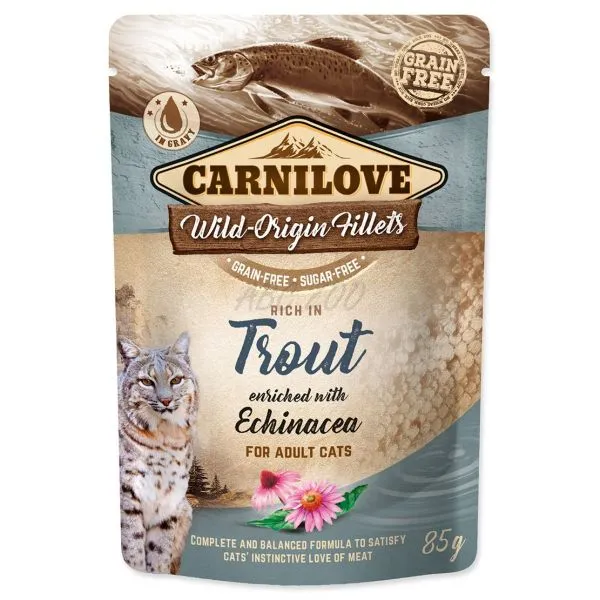 Carnilove este o hrană umedă, în sos, pentru pisicile adulte, cu păstrăv și echinaceea, fără cereale sau cartofi.