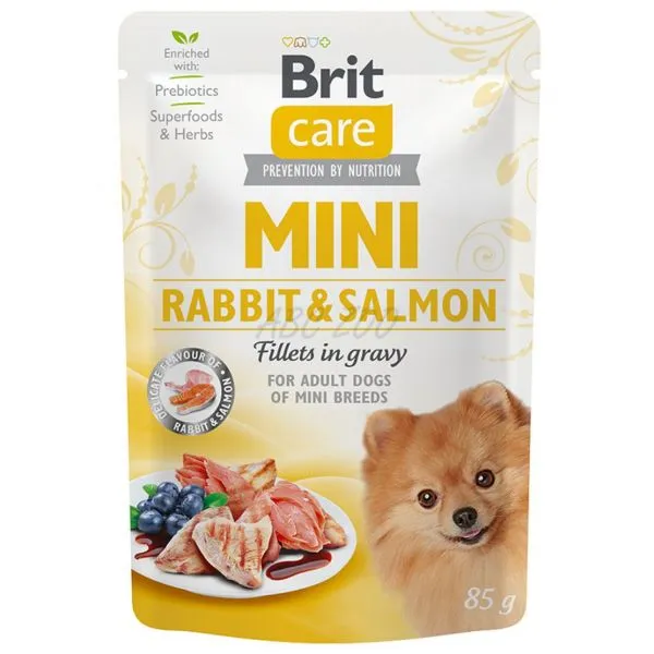 Brit Care Mini este o pungă plină de filleuri de carne de iepure și somon într-un sos gustos pentru câinii adulți de talie mică.