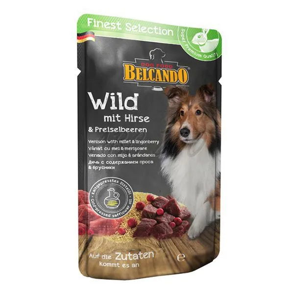Plic BELCANDO pentru câini – carne de vânat cu mei și merișoare. Mai multe detalii