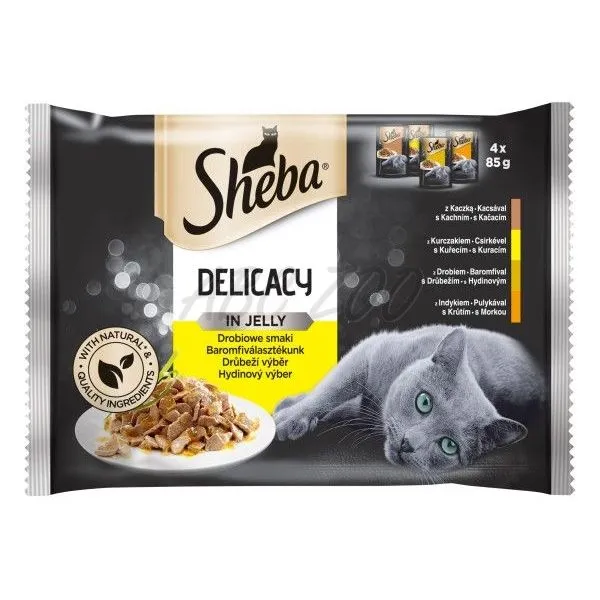 Sheba Delicacy este o selecție de pungi cu gelatină din păsări de curte pentru pisicile adulte.