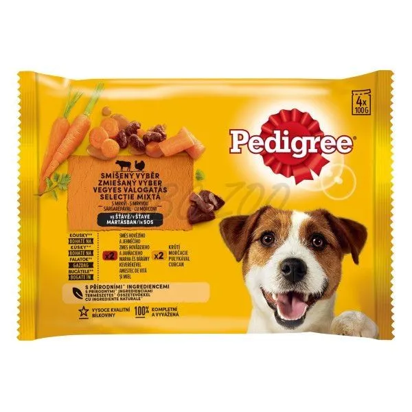 Pedigree este o hrană, umedă, echilibrată, cu carne de vită miel și curcan în sos, pentru câinii adulți de toate rasele.