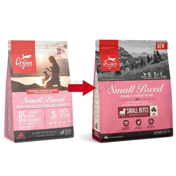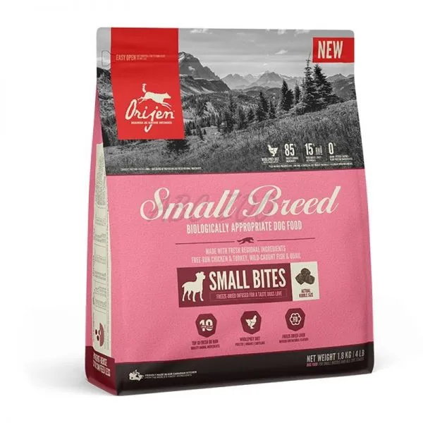 Orijen este o hrană fără cereale și echilibrată cu carne de pui, curcan, prepelițe crescute la sol și pești crescuți în habitat natural pentru câinii de rase mici, de orice vârstă.