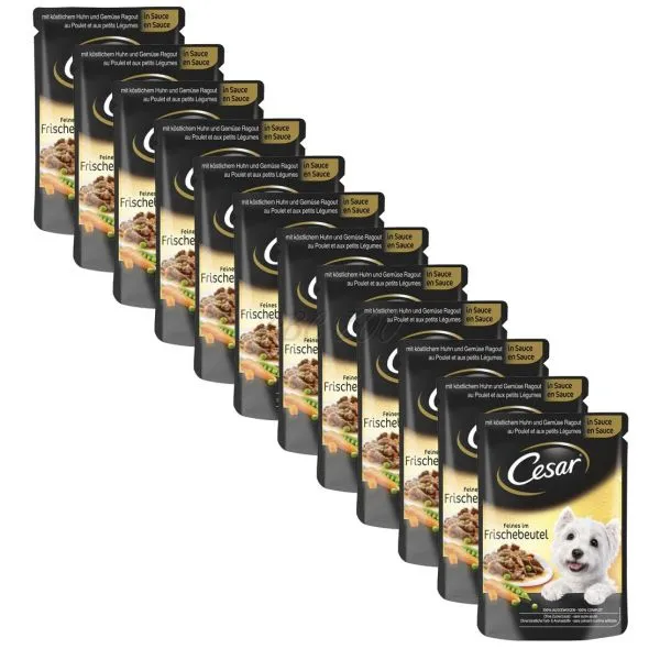 Cesar este o hrană completă și echilibrată, în pliculețe, cu carne de pui și gelatină gustoasă, pentru câinii adulți.