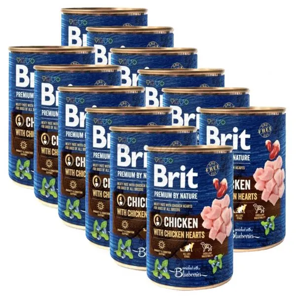 Brit premium hrană umedă cu pui și inimi pentru câinii adulți.