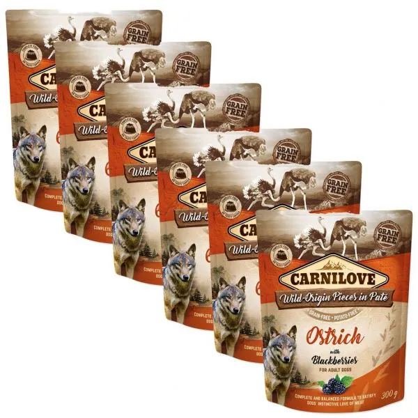 Carnilove este o hrană umedă, în pliculeț, pentru câinii adulți, cu carne de struț și afine, fără cereale sau cartofi.