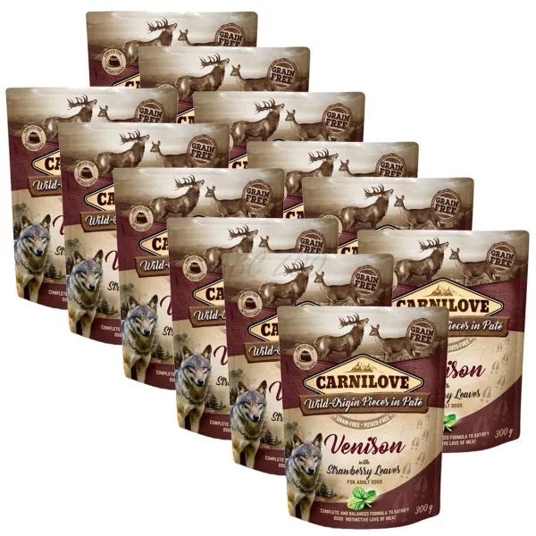 Carnilove este o hrană umedă, în pliculeț, pentru câinii adulți, cu carne de vânat și frunze de căpșuni, fără cereale sau cartofi.