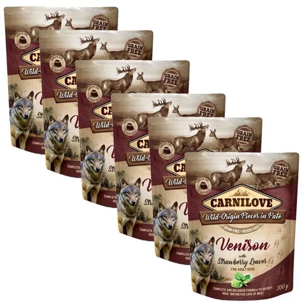 Carnilove este o hrană umedă, în pliculeț, pentru câinii adulți, cu carne de vânat și frunze de căpșuni, fără cereale sau cartofi.