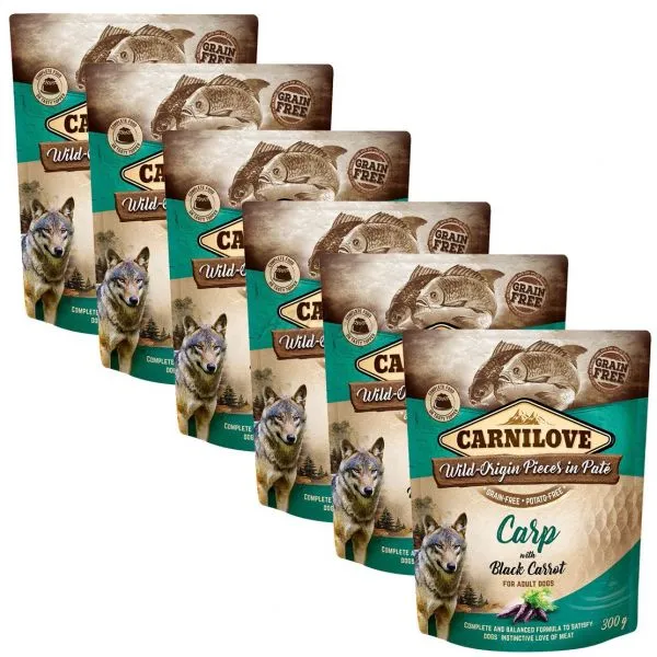 Carnilove este o hrană umedă, în pliculeț, pentru puii de câine, cu crap și morcovi negri, fără cereale sau cartofi.