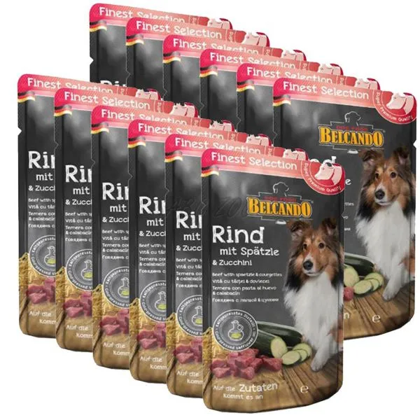 Plicul BELCANDO conține carne de vită cu tăiței și dovlecel potrivit pentru câini.