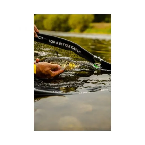Plasa din cauciuc negru este montată într-un cadru din aluminiu solid. Plasa de cauciuc de lungă durată se usucă foarte repede și nu absoarbe mirosul. După eliberarea clemei de siguranță, este posibil să coborâți capul năvodului de pescuit și să trageți mânerul spre interior, obținându-se astfel dimensiuni de transport foarte compacte. Năvodul de pescuit este potrivit atât pentru crapul mare, cât și pentru prădătorii pescuiți la mal și din barcă.