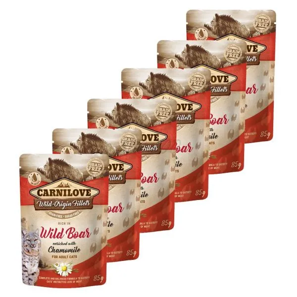 Carnilove este o hrană umedă, în sos, pentru pisicile adulte, cu carne de mistreț și mușețel, fără cereale sau cartofi.