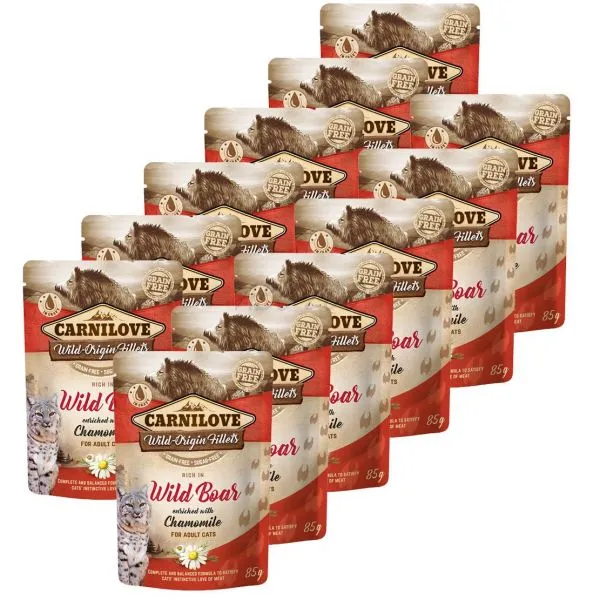 Carnilove este o hrană umedă, în sos, pentru pisicile adulte, cu carne de mistreț și mușețel, fără cereale sau cartofi.