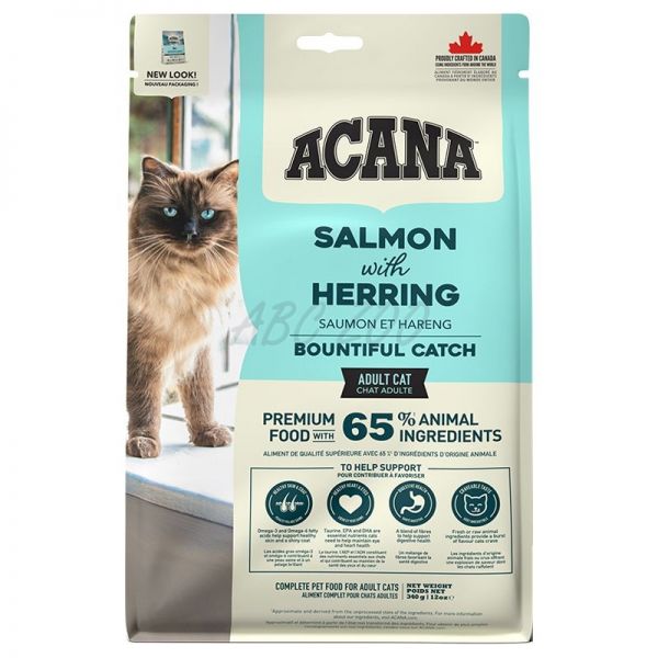 Acana este o hrană sănătoasă și echilibrată cu somon, păstrăv, hering și merluciu crescut în habitat natural pentru pisici adulte.