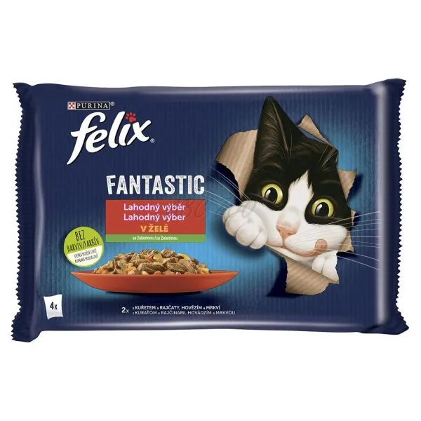 FELIX Fantastic sunt pliculețe delicioase cu legume, pentru pisici, cu carne de vită și morcovi în gelatină, cu pui și roșii în gelatină.