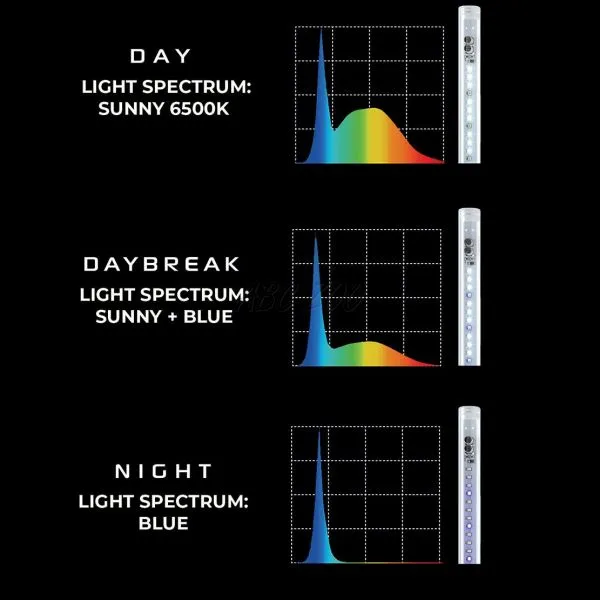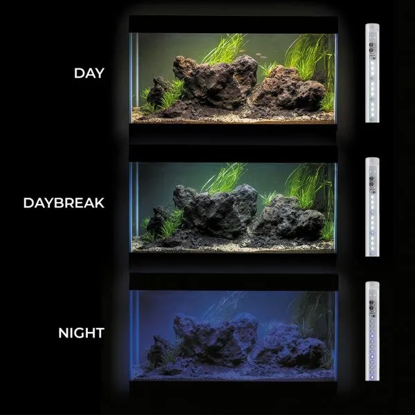 • în mod de iluminare NIGHT furnizează lumină albastru - închis, imită lumina naturală a lunii (se recomandă pentru acvariile cu pești care sunt activi mai ales noaptea, astfel încât pot fi observați după ce se închide lumina zilei)