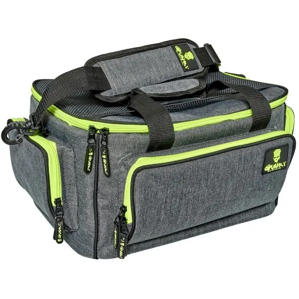 Geantă bine concepută, perfectă pentru năzi si momeli mari. Vine cu două cutii de năzi de capacitate mare 31,5x23x8cm. Deschidere frontală cu multe buzunare laterale pentru depozitarea tuturor accesoriilor. Curea de umăr confortabilă. Fund reîntărit.