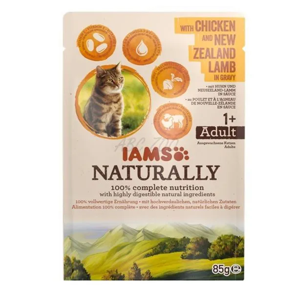 IAMS Naturally este o hrană completă, echilibrată  cu pui și miel, pentru pisicile adulte.