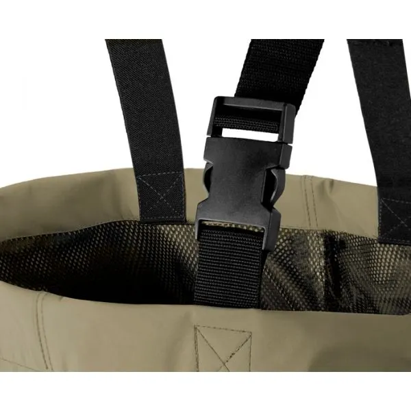 Modelul de wadersi Delphin HRON este construit din materiale de calitate excelentă . Am acordat o atenție deosebită la detalii astfel încât să vă oferim un produs perfect adaptat nevoilor dumneavoastră. Materialul modern din care sunt construiți acești wadersi oferă o rezistență completă împotriva apei. Greutatea redusă a materialului îi face foarte comfortabili la purtat. În completare, la interior wadersii sunt prevăzuți cu o plasă care reduce contactul materialului cu pielea reducând semnificativ transpirația. Un bonus suplimentar al acestor wadersi este întăritura de neopren din zona genunchilor care ușurează menținerea poziției în genunchi. Pe lângă cele două bretele ajustabile de umăr, acest model este prevăzut deasemenea și cu o curea detașabilă pentru talie. Cizmele au o talpă ranforsată din cauciuc pentru a asigura aderență optimă în orice condiții. Pentru a putea fi descălțate cu ușurință aceste cizme sunt prevăzute cu un pinten în zona călcâiului. Material: taslon/PVC