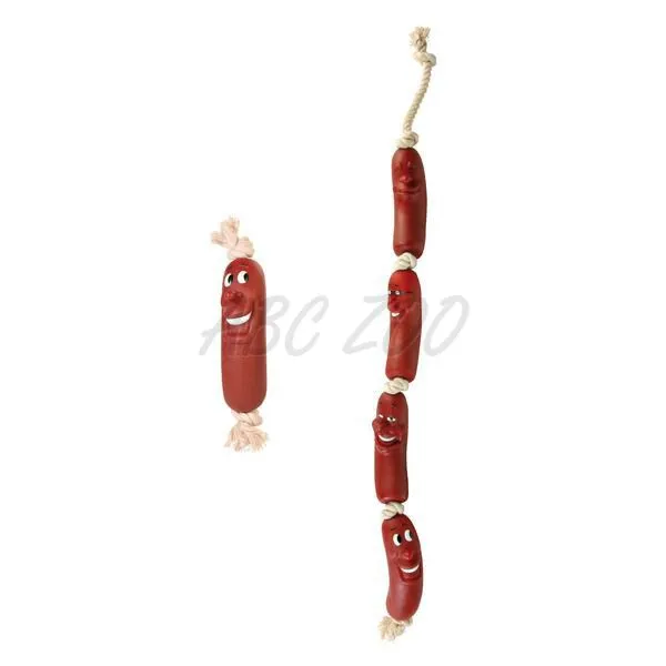 Jucărie din cauciuc pentru câini, cârnaţi zâmbăreţi pe funie. Mai multe detalii